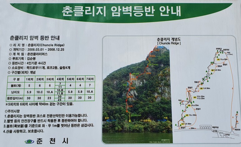 의암댐 피임 터널을 지나서 200m 정도를 가면, 춘클 등반코스가 있다. 우리나라에서 경치 좋은 등반 코스 중에 한 곳이다.