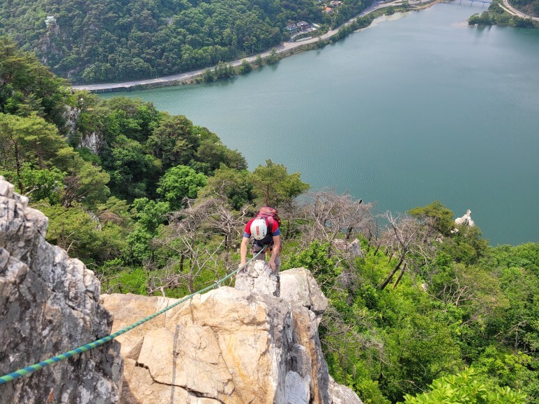 #춘클릿지 #릿지등반 코스는 총 7 피치. 4인 기준으로 약 4시간 정도가 소요된다. 1 피치의 난이도 5.9, 가볍게 몸 푸는 구간이고, 2 피치(10c), 3 피치(10a) 구간을 지나면 제법 텐션이 붙는다.
