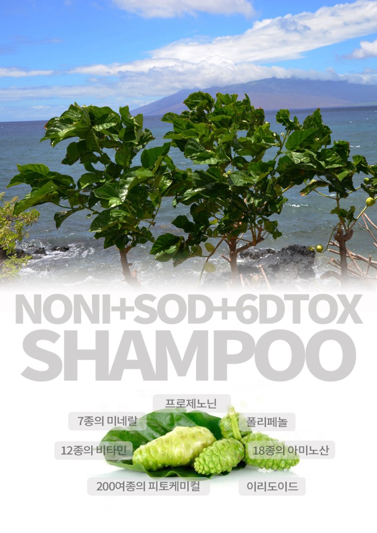 노니 샴푸는 특별한 8가지 성분(노니, SOD, 6가지 DTOX)과 무실리콘, 무파라벤, 천연 식물성 계면활성제, 피부 저자극 성분으로 만들었습니다.