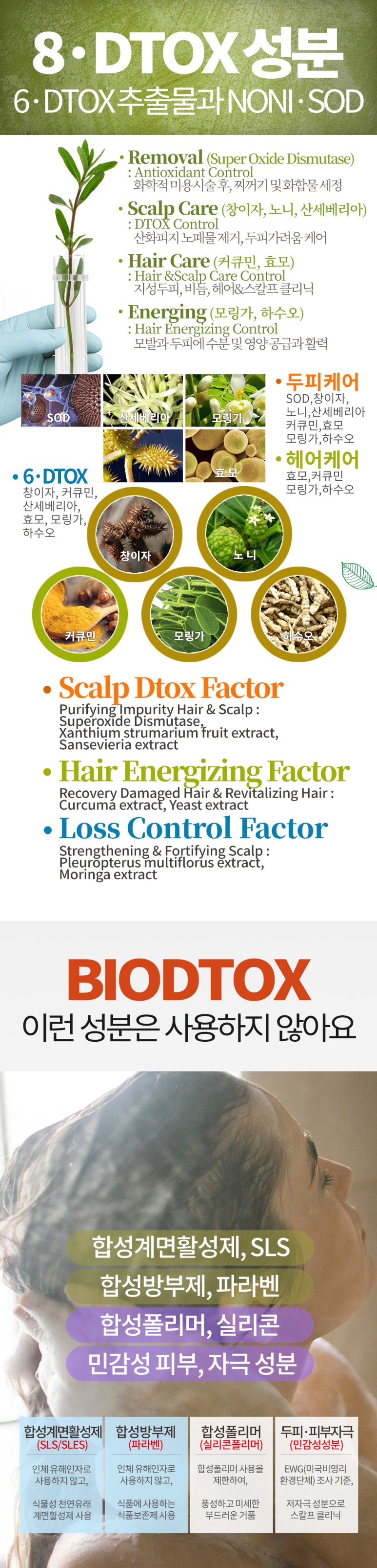 8가지 DTOX 성분이 두피와 모발을 건강하게 하고, 투명하고, 점성이 낮은 거품이 가볍고 미세하며, 피부 저자극으로 세정력이 좋습니다.